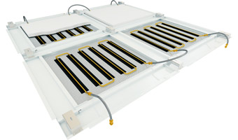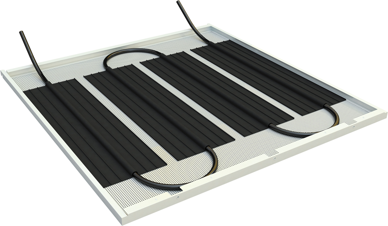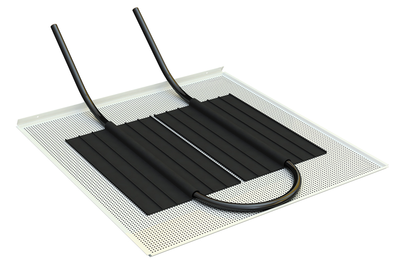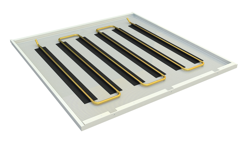 The system is composed of active and inactive steel sheet panels, steel sheet carrying elements and a suspension system by means of rigid hangers that allow to obtain perfect flatness and horizontality of the false ceiling. Two types of activation (A and C) enable to satisfy different thermal output requirements.