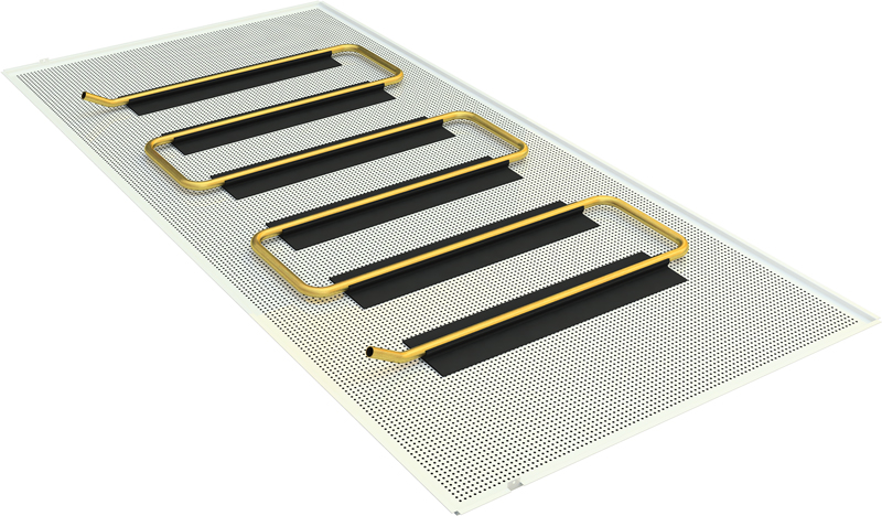 The availability of the micropunched panels is particularly useful to exploit the plenum for the delivery of the renewal dehumidified air or to improve the room acoustics thanks to the high sound-absorbing power. An apposite thermo acoustic panel made of polyester fibre, can be placed on the upper part of the panels when thermal insulation upwards or an increase of the acoustic performance are needed.