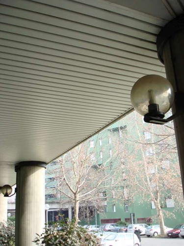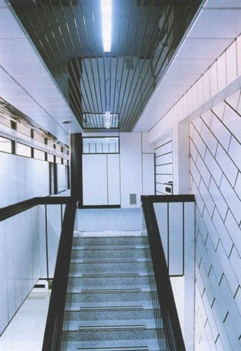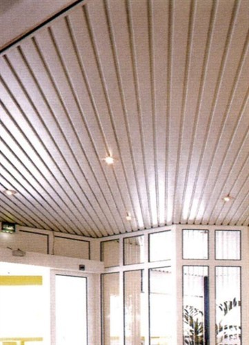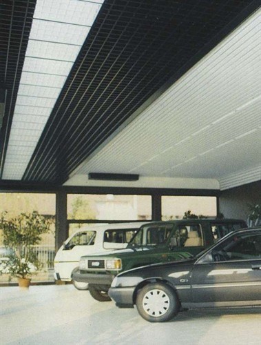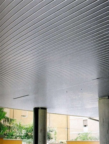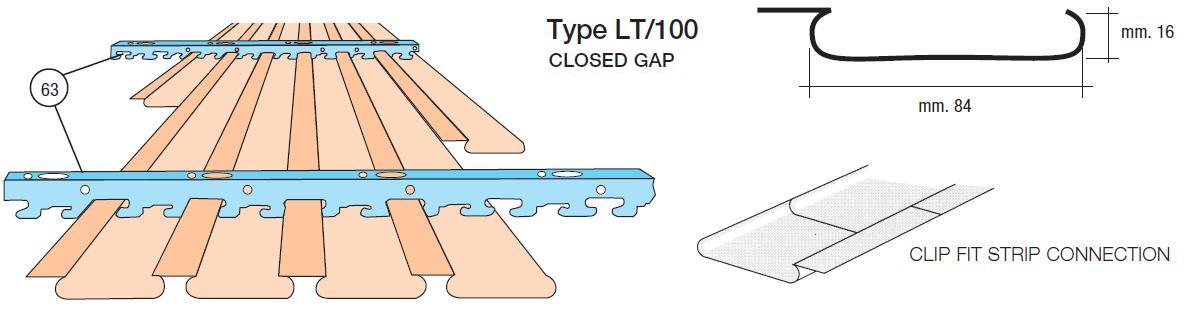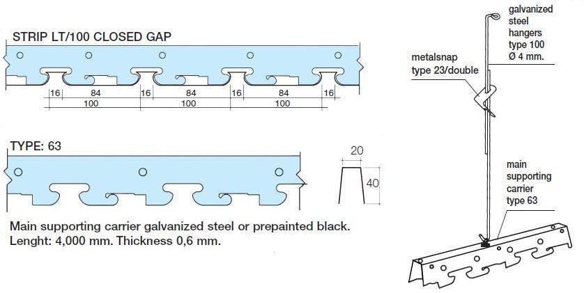 False ceilings system composed with linear strips Type METALSCREEN "LT CLOSED GAP" width mm.100 closed gap (thickness and colour choosed by the consultant) aluminium prepainted thickness mm.0,5-0,6. The Type METALSCREEN "LT CLOSED GAP" strips will be installed on supporting main carrier Art. 63 galvanized hot dipped steel or painted black thickness mm.0,6 and suspended with rigid steel galvanized hangers Art. 100 with metal snap suspension Art. 23/D, finished with perimetrical wall angle frames “L” section Art. RA with connection joint. To obtain the best soundproofing result the Type METALSCREEN "LT CLOSED GAP" strips must be perforated with holes diameter Ø mm.3 or Ø mm.2 on the total surface with acoustical “TNT” non vowen textile thermal applied on the back of each strip.