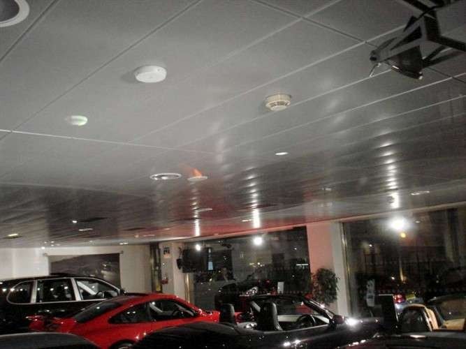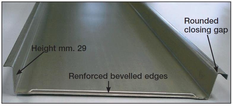 False ceilings system composed with self supporting linear strips Type METALSCREEN "LD/300-R SELF SUPPORTING" height mm.29 height closed joint mm.10 width mm.300 (width and colour choosed by the consultant) aluminium prepainted thickness mm.0,6. The Type METALSCREEN "LD/300-R SELF SUPPORTING" strips will be installed lay-on the perimetrical wall angle frames “L” section Art. RA with connection joint. The strips must be height mm.29 and with the renforced bevelled edges to obtain a perfect complanarity of the final result of the ceilings. To obtain the best soundproofing result the Type METALSCREEN "LD/300-R SELF SUPPORTING" strips must be perforated with holes diameter Ø mm.3 or Ø mm.2 on the total surface with acoustical “TNT” non vowen textile thermal applied on the back of each strip.