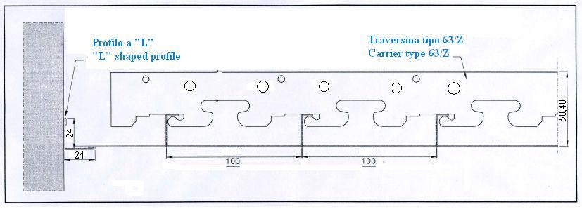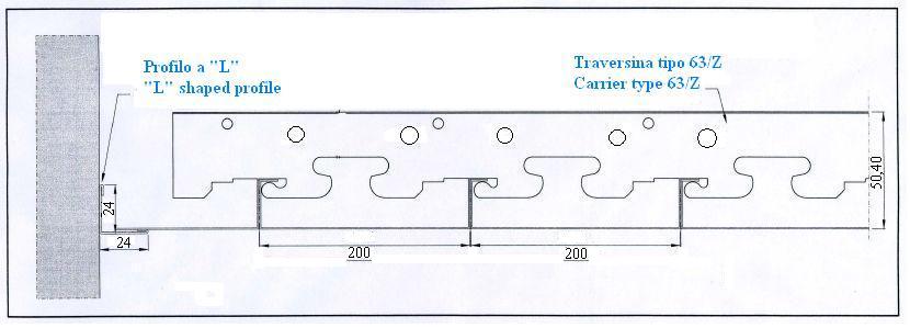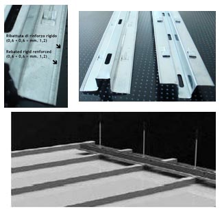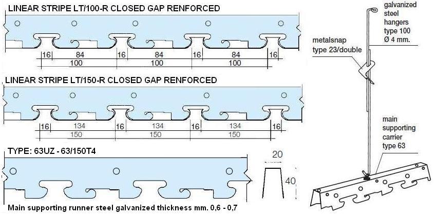 False ceilings system composed with linear strips Type METALSCREEN "LT-R RENFORCED" closed gap width mm.100 - mm.150 (thickness and colour choosed by the consultant) aluminium prepainted thickness mm.0,6 or galvanized steel prepainted thickness mm.0,5. The Type METALSCREEN "LT-R RENFORCED" strips will be installed on supporting main carrier Art. 63 galvanized hot dipped steel thickness mm.0,6-mm.0,7 (request) and suspended with rigid steel galvanized hangers Art. 100 with metal snap suspension Art. 23/D, finished with perimetrical wall angle frames “L” section Art. RA with connection joint.