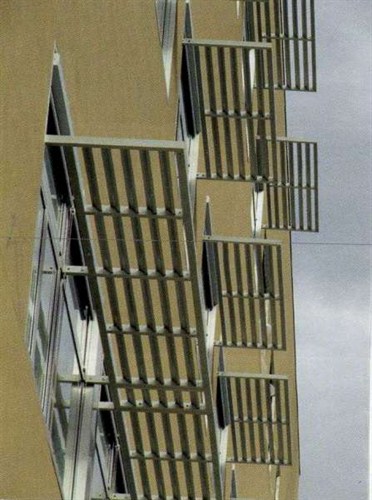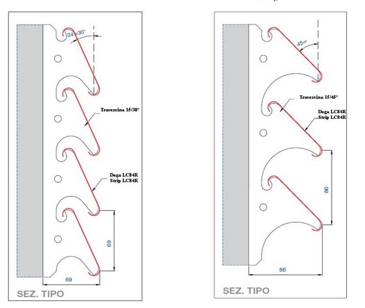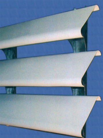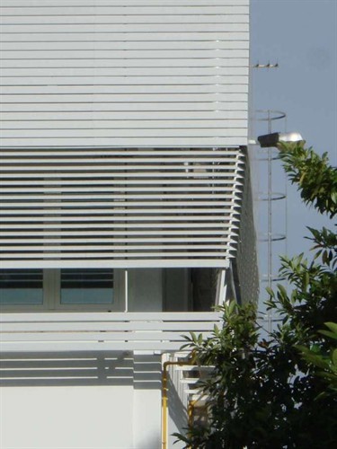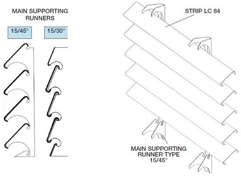 External cladding with linear strips mm.84 Type METALSCREEN "LC 84 FRANGISOLE” sun breaker to obtain a sun louver with inclination degrees 30° or 45° (the inclination 30° or 45° and colour choosed by the consultant). The strips are made of prepainted aluminium corrosionproof incombustible class “0” - Euroclass fire reaction A1 width mm.84 with round angles and thickness of mm.0,6. The Type METALSCREEN “LC 84 FRANGISOLE” sun breaker will be installed clip-on main supporting carriers installed each mm.600 between the carriers are made of prepainted aluminium thickness mm.1,00 and colour white on both sides.